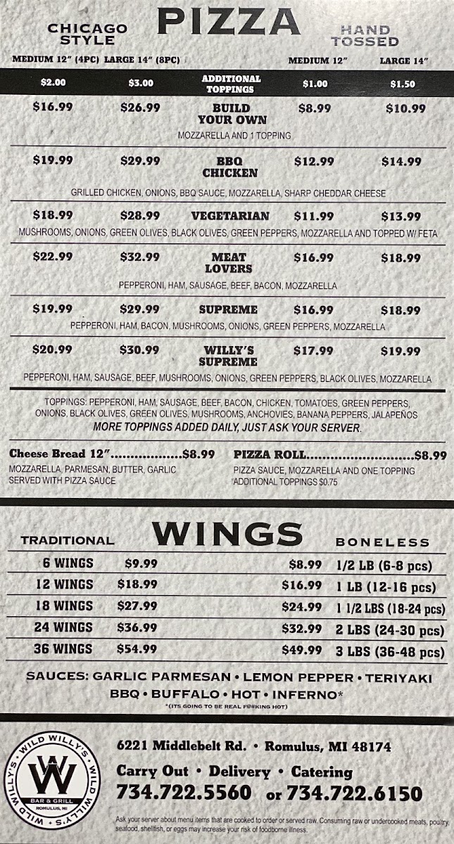 Welcome to Wild Willy's Bar & Grill, a hidden gem nestled at 6221 Middlebelt Rd, Romulus, MI. This lively establishment is where lovers of hearty meals and genuine hospitality come to indulge. Whether you are a burger aficionado or a pizza enthusiast, Wild Willy's promises to deliver a flavorful experience that will leave you craving more.